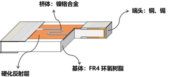 在極薄的鎳鉻合金材料上采用半導(dǎo)體薄膜蝕刻工藝制程的電阻(2~8Ω),通過過載電流使合金橋體發(fā)生拉弧并引燃點(diǎn)火藥,最終電能轉(zhuǎn)爆轟實(shí)現(xiàn)能量轉(zhuǎn)換的目的,也有“換能元”“起爆電阻”等叫法。